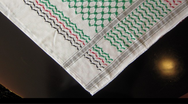 Black and white, and red and white ones made in Jordan; flag colors tailored in the USA for ‘Team Falasteen’ out of kufiyehs made in Palestine.