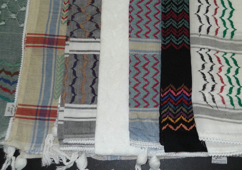 Colored kufiyeh scarves, made in Hebron, Palestine by the Herbawi Textile Factory.