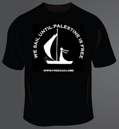 Produced for the Free Gaza Movement, this shirt insists that the flotillas will continue until the siege of Gaza ends and Palestine is free and the Palestinian people enjoy sovereignty, including the ability to have visitors independently of the whims of the Israeli occupiers.